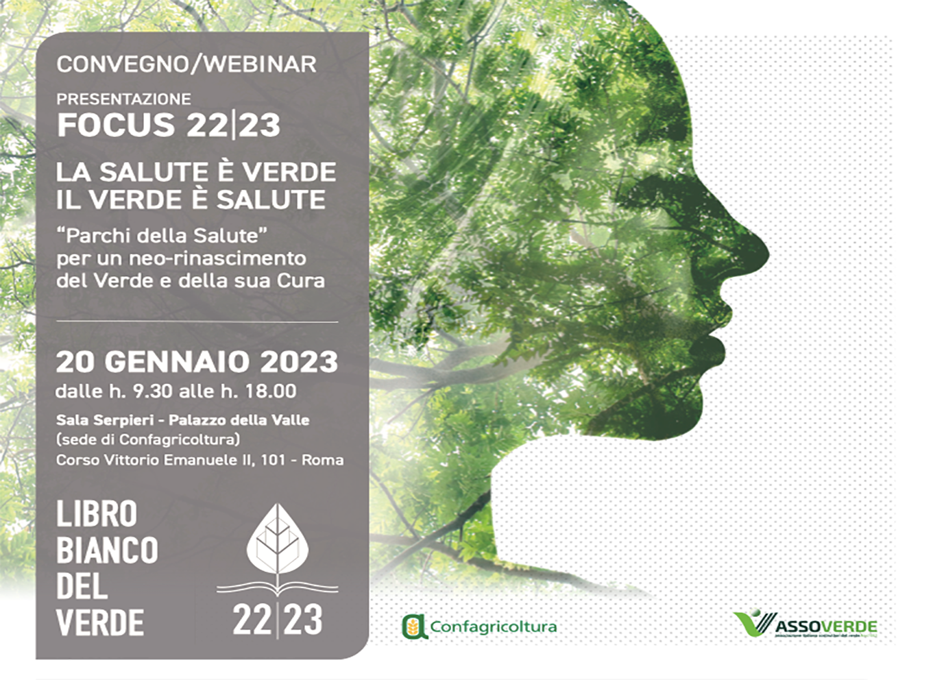 il prossimo 20 gennaio (ore 9:30-18:00), a roma, a palazzo della valle (sede di confagricoltura), corso vittorio emanuele II 101, e in modalita’ webinar, confagricoltura e assoverde presentano il nuovo focus 22/23 del libro bianco del verde – la salute e’ verde / il verde e’ salute “parchi della salute”. per un neo-rinascimento del verde e della sua cura. lo rende noto un comunicato di confagricoltura, che prosegue: “professionisti del verde e medici in collaborazione con il crea e l’istituto superiore di sanita’ per progettare e certificare i nuovi ‘parchi della salute’. una giornata di studio con esponenti istituzionali, docenti e studiosi di universita’ ed enti di ricerca, tecnici, esperti, imprenditori e professionisti. un evento di elevato valore scientifico a sostegno dei processi di rigenerazione urbana. partecipano, fra gli altri, rosi SGARAVATTI, presidente assoverde e associazione italiana costruttori del verde, massimiliano GIANSANTI, presidente confagricoltura, carlo GAUDIO, presidente crea, patrizio giacomo LA PIETRA, sottosegretario di stato ministero agricoltura, sovranita’ alimentare e foreste, luca DE CARLO, presidente commissione industria, commercio, turismo, agricoltura e produzione agroalimentare del senato”. programma e modulo d’iscrizione su assoverde .it/convegno-e-webinar-20-gennaio.
