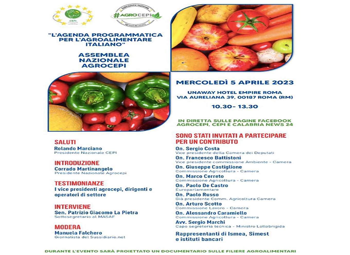 “‘l’agenda programmatica per l’ agroalimentare italiano’ e’ il titolo della assemblea nazionale di agrocepi che si terra’ il 5 aprile alle 10.30 a roma, all’unaway hotel empire roma”, informa un comunicato di agrocepi. “la nostra organizzazione vuole proporre al governo e al parlamento una traccia di lavoro comune per fare dell’ agroalimentare italiano il piu’ grande polo di sviluppo del paese, coniugando anche alcuni valori socio – economici strategici: le produzioni eccellenti, l’ enogastronomia e la qualita’ ambientale dei diversi territori. ci confronteremo innanzitutto con il sottosegretario al masaf LA PIETRA e con diverse istituzioni e parlamentari, a partire, tra gli altri, dal vicepresidente della camera sergio COSTA, dei deputati BATTISTONI, CASTIGLIONE, CERRETO, CARAMIELLO, SCOTTO, dell’ europarlamentare paolo DE CASTRO”, ha dichiarato il presidente nazionale agrocepi corrado MARTINANGELO presentando l’assemblea. “l’ assemblea rappresentera’ inoltre una tappa fondamentale per dare un nuovo impulso alle attivita’ di agrocepi- federazione agroalimentare, aderente a cepi, nata proprio ad aprile di 6 anni fa. sara’ anche l’ occasione per ricordare un grande imprenditore del settore, mimmo DE LUCIA, scomparso prematuramente nello scorso settembre e tra i primi soci di agrocepi”, ha concluso MARTINANGELO.