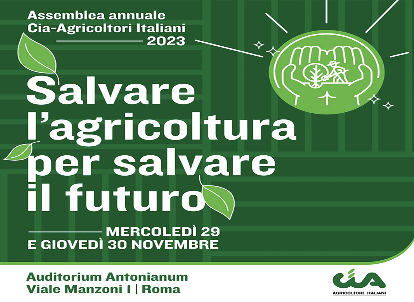 “‘salvare l’agricoltura per salvare il futuro’ e’ con questo claim che cia-agricoltori italiani annuncia la sua prossima assemblea annuale in programma, a roma, mercoledi’ 29 novembre, all’auditorium antonianum, in viale manzoni 1”. lo rende noto un comunicato di cia, che cosi’ prosegue: “secondo programma, alle 9:30, la registrazione dei partecipanti e l’avvio dei lavori, alle 10:15, con la relazione introduttiva del presidente nazionale di cia, cristiano FINI. a seguire, dalle 10:30, gli interventi istituzionali. parteciperanno il ministro delle infrastrutture e dei trasporti, matteo SALVINI; il ministro degli affari esteri e della cooperazione internazionale, antonio TAJANI; la segretaria del partito democratico, elly SCHLEIN; il presidente della regione emilia-romagna, stefano BONACCINI. alle 12:30, la parola al ministro dell’agricoltura, della sovranita’ alimentare e delle foreste, francesco LOLLOBRIGIDA. sono stati invitati a partecipare: il presidente del movimento 5 stelle, giuseppe CONTE e il segretario di azione, carlo CALENDA. modera la giornalista del tg1, barbara CAPPONI. la ripresa dei lavori, alle 14:15, con la tavola rotonda sul ‘piano nazionale per l’agricoltura e l’alimentazione’. presenti: daniela STORTI, ricercatrice senior del crea; fabian CAPITANIO, professore dell’universita’ degli studi di napoli federico II; maria chiara ZAGANELLI, direttore generale ismea; nicola DELL’ACQUA, commissario straordinario per l’emergenza idrica e silvio SALVI, presidente societa’ italiana di genetica agraria-siga. alla giornata d’apertura seguiranno, giovedi’ 30 novembre, i lavori confederali a porte chiuse. e’ possibile seguire il live streaming al link https://bit.ly/3SWKqYe“.